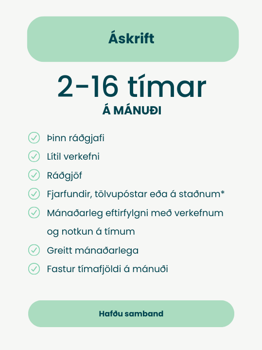 Áskriftin hentar þér ef þú þarft allt að 16 klukkustundir á mánuði í ráðgjöf. Ef þú þarft meira en 16 klukkustundir á mánuði eða aðra þjónustu, t.d. þjálfun, verkefnastjórnun, breytingastjórnun o.s.frv. þá hentar leiga á gæða- og/eða öryggisstjóra þér betur.